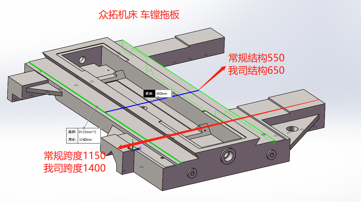 車鏜床結(jié)構(gòu)拖板相對于普通結(jié)構(gòu)拖板進行了充分的加強:拖板跨度加大、厚度加厚、燕尾跨度及高度增加、拖板后側(cè)增加安裝鏜桿支架底座的安裝面并加大了厚度;